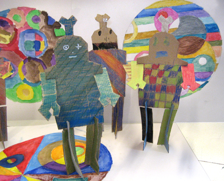 Inspireret af billeder af Sonia Delauney arbejdede familieholdet i lørdags med former og farver. Der blev lavet grafiske plakater og konstrueret robotter.